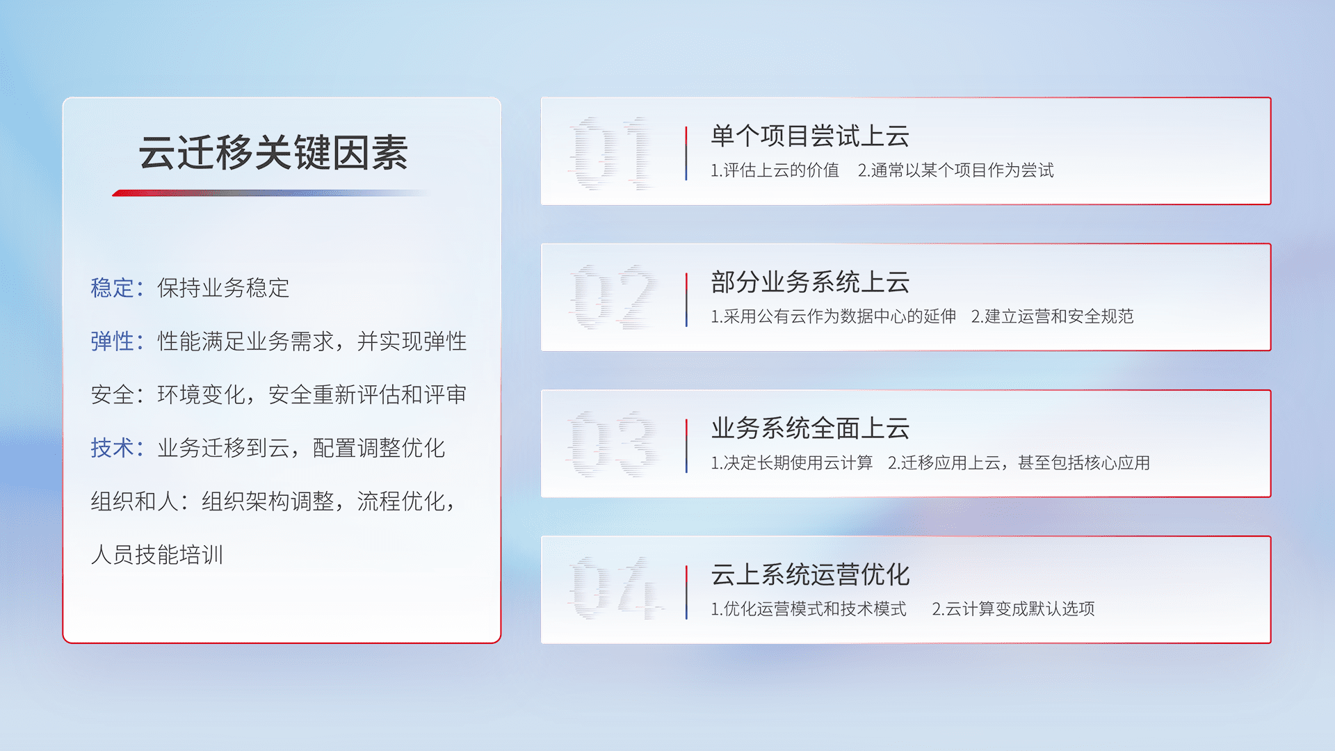 结合实际业务,,从规划设计、、云平台选型、、、、云原生改造、、、、数据迁移、、、、集成交付,,迁移全过程为客户识别最佳上云路径,,,做好风险识别管理,,设计网络架构、、、身份权限、、、安全审计合规、、操作审计、、、日志审计、、监控告警策略、、多站点容灾设计等,,对云上基础设施进行整体规划,,,,提升IT治理水平,,以满足弹性、、、、高可用、、高性能的需求。。