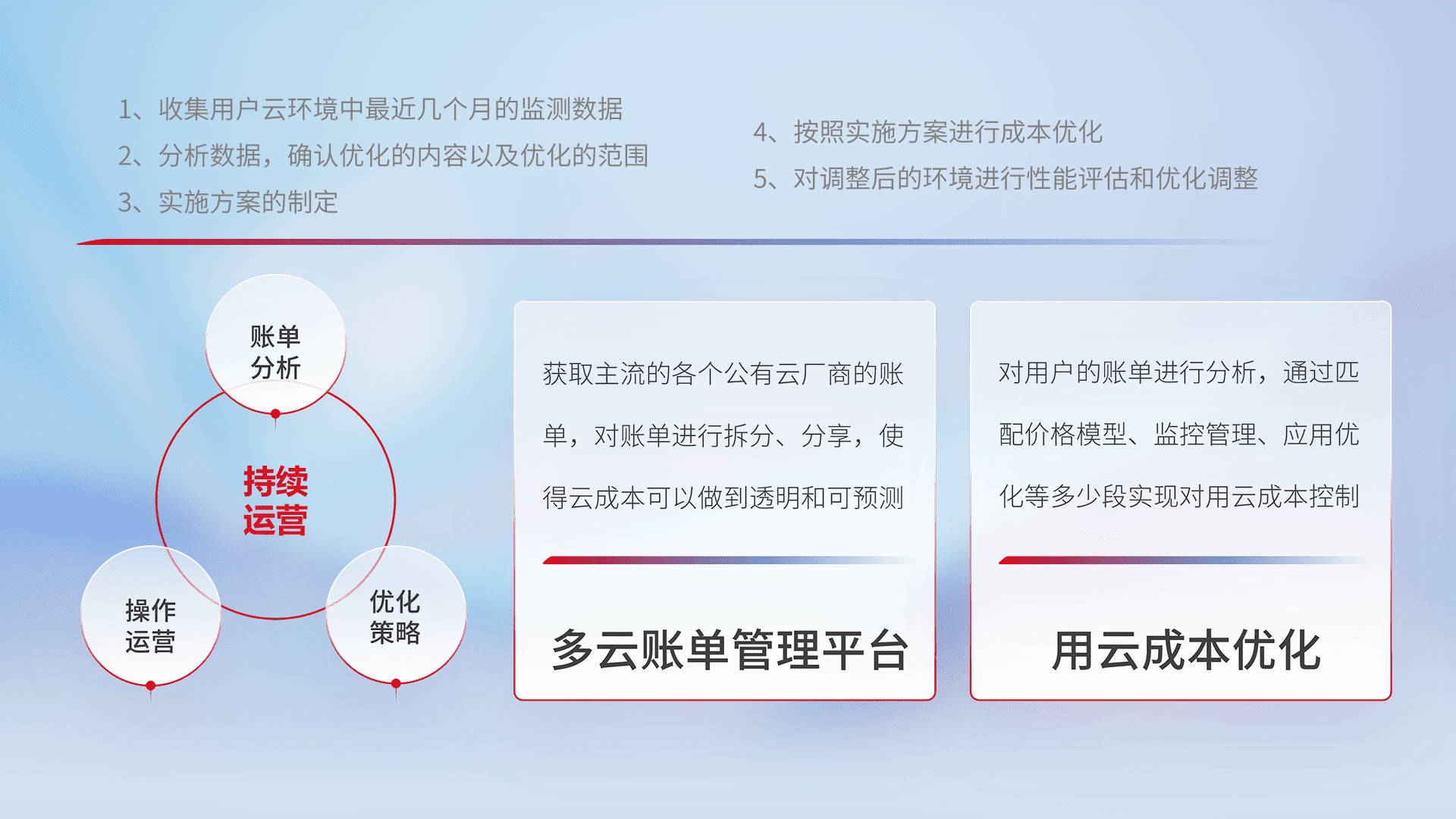 通过多云纳管,,,以统一的资源数据模型把客户的云资源进行抽象和封装,,进而实现对多云资源的统一操作,,,保障云资源管理的可靠性、、稳定性与可用性。。。。量身定制化运维内容,,,,配置、、、开发运维、、补丁管理、、、、备份、、、、监控、、认证和访问管理、、、、审计和日常巡检等,,保障在用云过程中的可靠度,,,稳定度以及高可用率。。